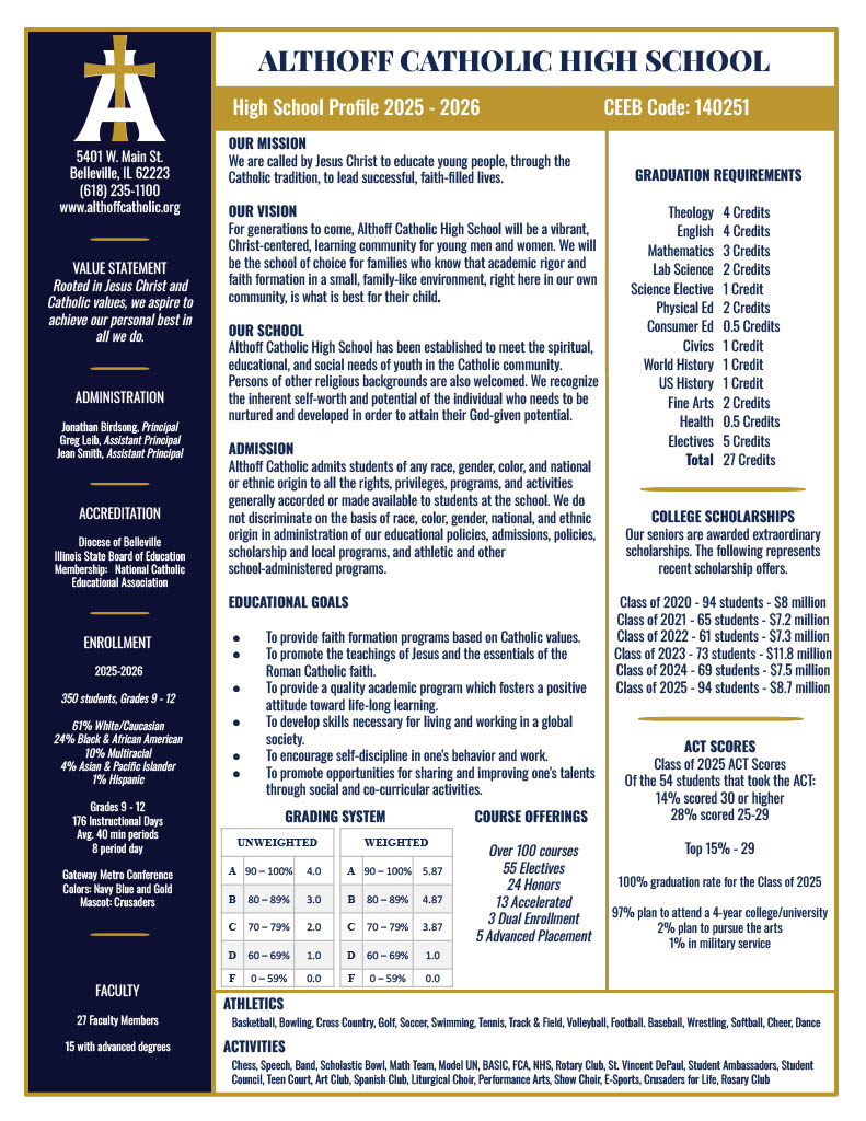 At Althoff Catholic, our goal is simple: prepare our students for college and life after graduation. We accomplish this through academic rigor, caring and dedicated faculty, and a nurturing environment that concentrates on finding each student's potential and maximizing their ability. We have a modern approach to education, while staying rooted in the rich tradition of our Catholic faith. Our success is their success, which is why we build a curriculum to ensure 98% of our students continue on to college with more than $8 million dollars in annual scholarship offers per class.